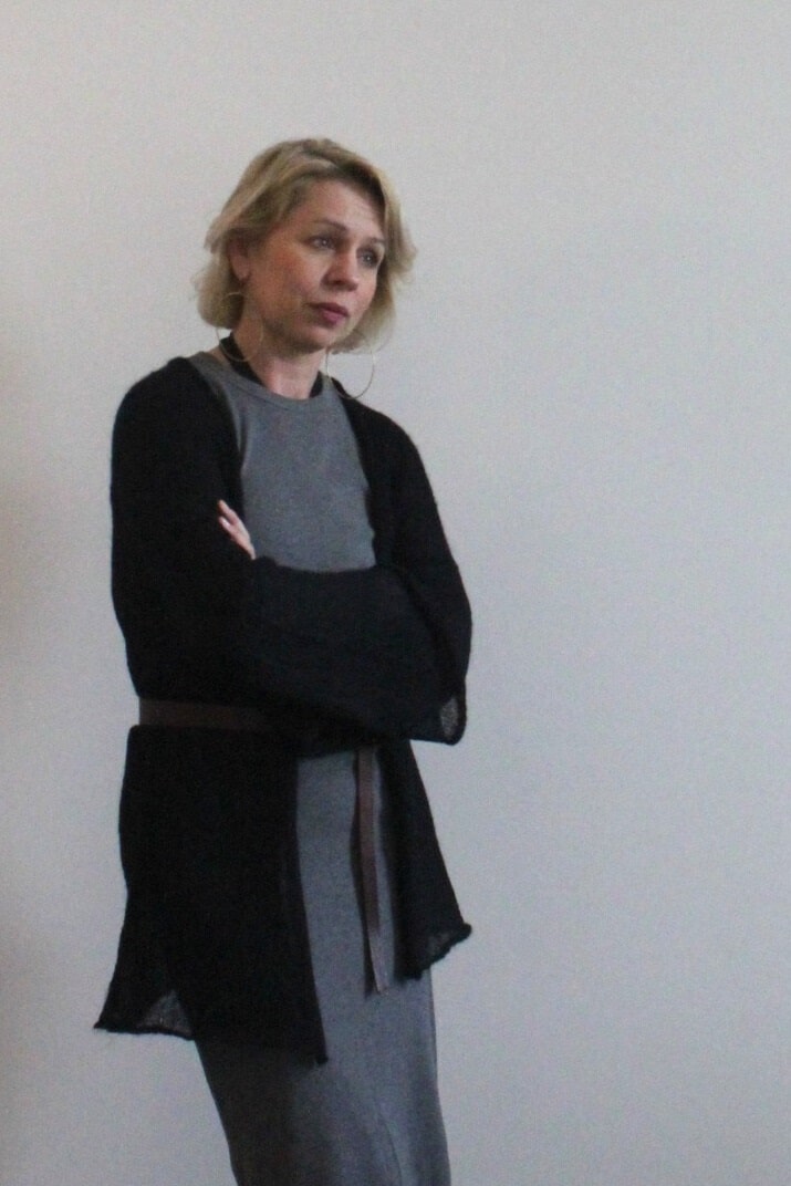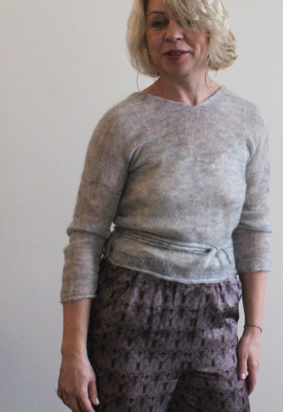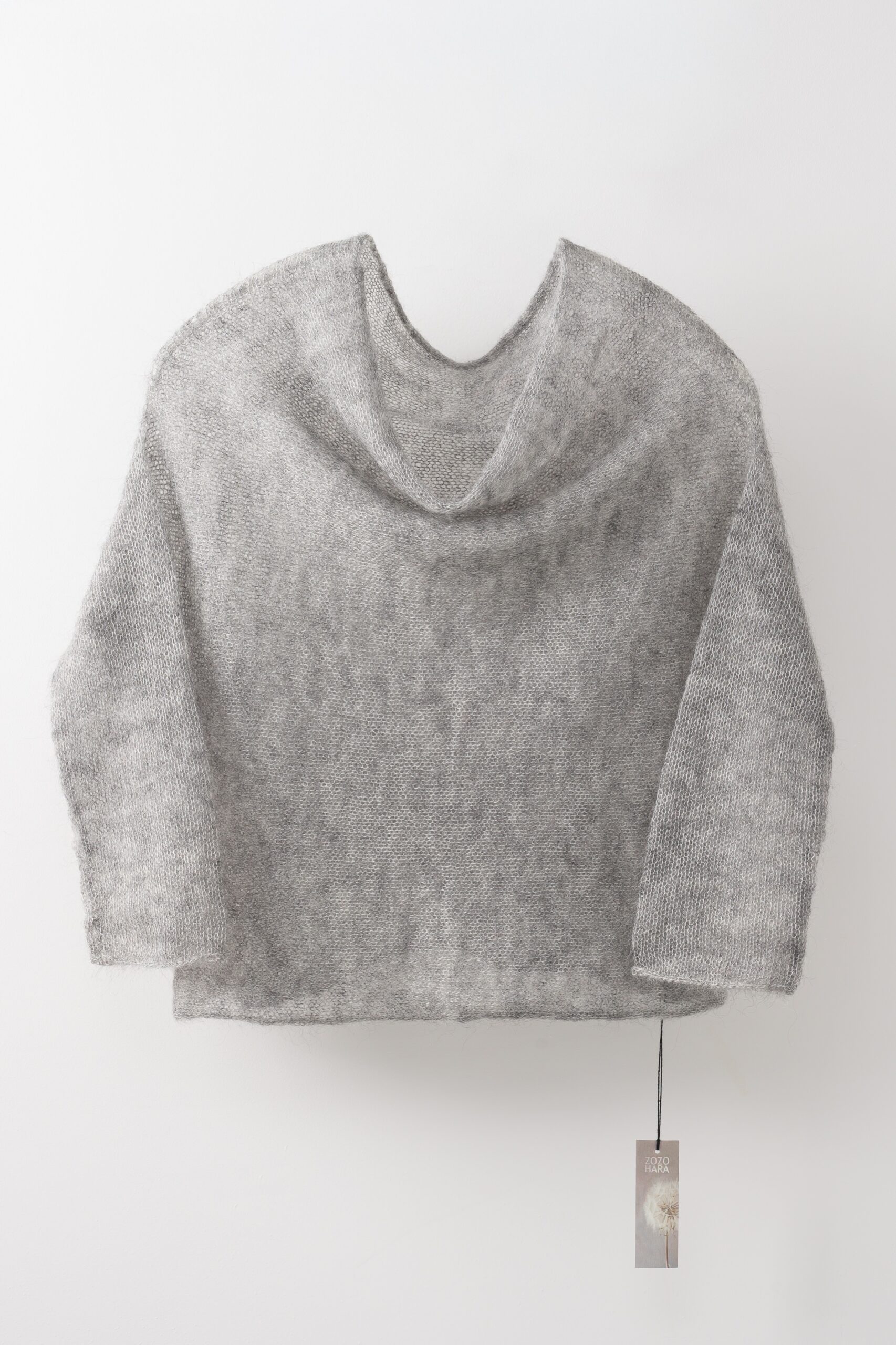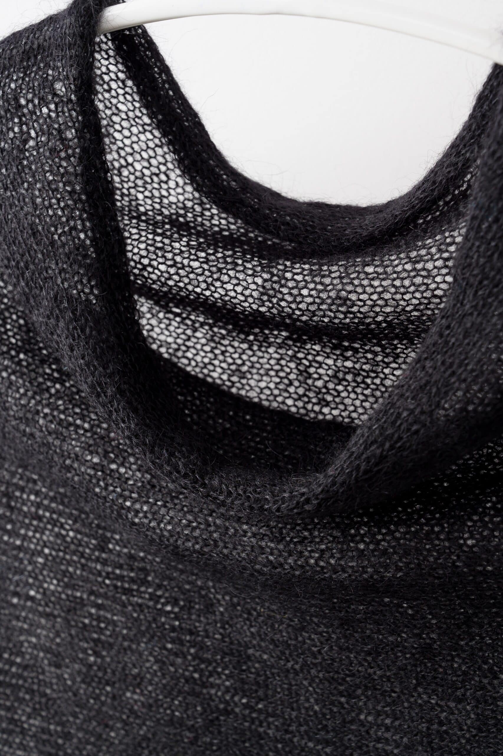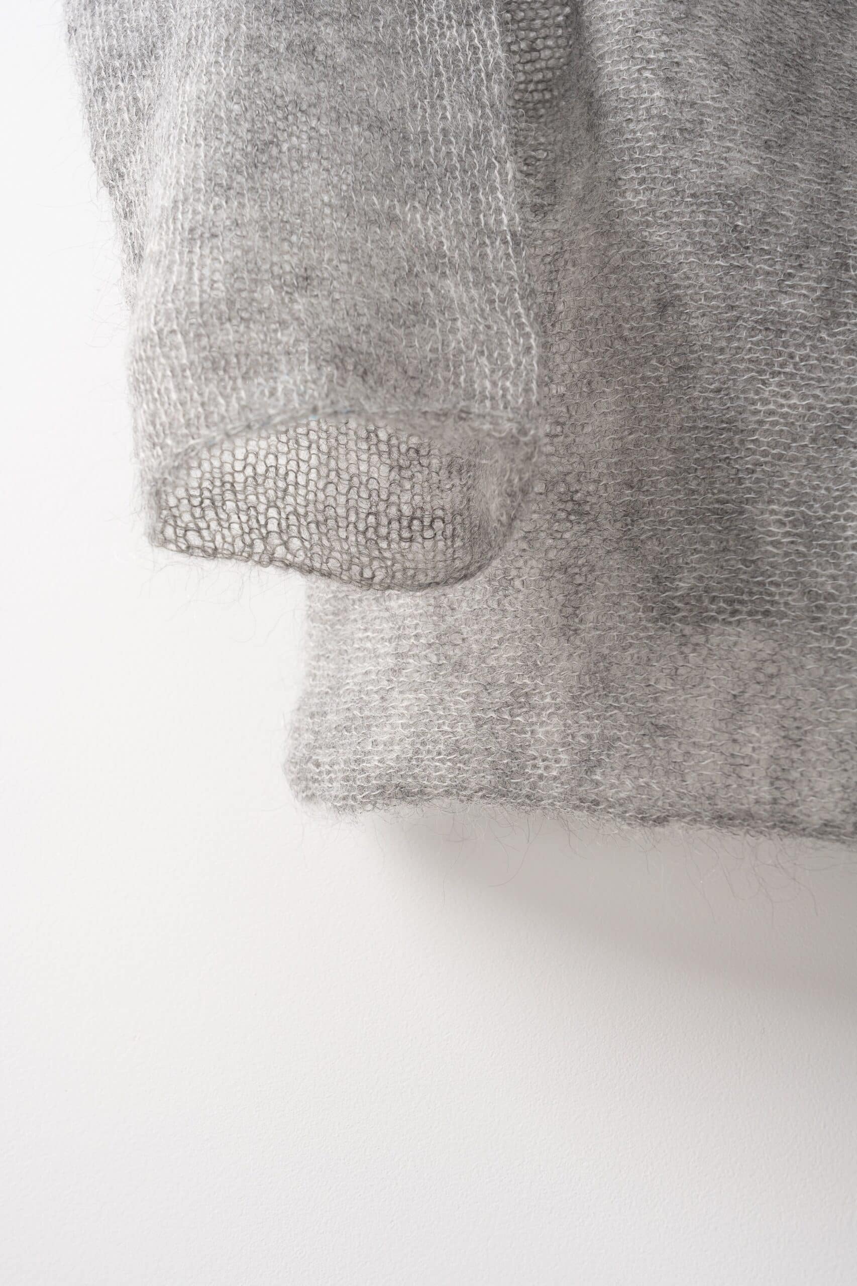 Sweterek wykonany z cienkiego moheru, wkładany przez głowę, dekolt – lekko opadająca łódka. Rękawy 3/4 wąskie. Wykończony gładko.